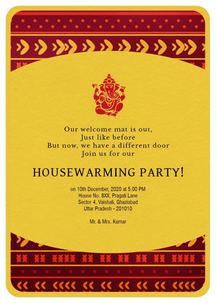 Dear friend, I and my whole family are inviting you and your family to our housewarming ceremony held at [date]. Please join us in starting our new phase of life.