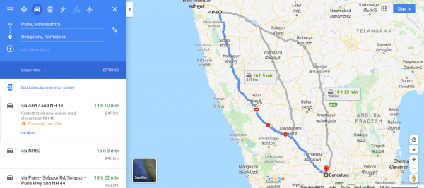 If you are traveling via NH 50 then again the Pune to Bangalore distance is approximately 841 kms. On this route, your travel time will be 16 hours and 17 minutes.